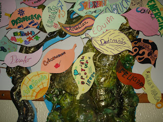 Depois de escritas as palavras, na aula de Expressão Artística, cada uma das folhas foi decorada a gosto e colocada na Àrvore PIEF, que está dentro da nossa sala de aulas. Assim, nos momentos em que estejamos a ficar um pouco esquecidos dos nossos objetivos, vamos olhar para ela, ler e interiorizar a sua mensagem.